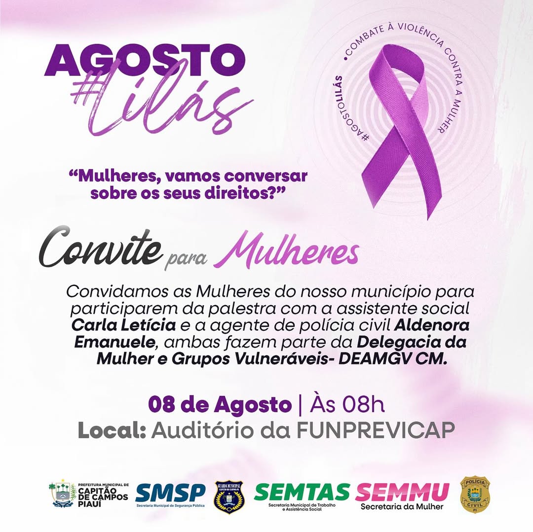 Em alusão ao Agosto Lilás, mês de conscientização pelo fim da violência contra a mulher, a Prefeitura Municipal de Capitão de Campos convida todas as mulheres do município para participarem de uma importante palestra sobre seus direitos e proteção.