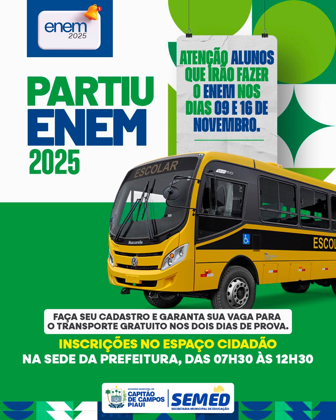 A Prefeitura de Capitão de Campos, por meio da Secretaria Municipal de Educação (SEMED), está disponibilizando transporte gratuito para os alunos que irão participar do Exame Nacional do Ensino Médio (ENEM) 2025, que acontece nos dias 9 e 16 de novembro.