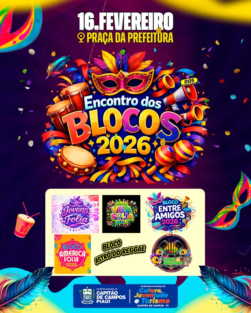 O Carnaval 2026 já começa a ganhar forma em Capitão de Campos e promete ser marcado por alegria, música e muita participação popular. Com o tema “Vista seu abadá e venha pra folia”, o evento reunirá diversos blocos carnavalescos, fortalecendo a cultura local e celebrando uma das festas mais tradicionais do país.