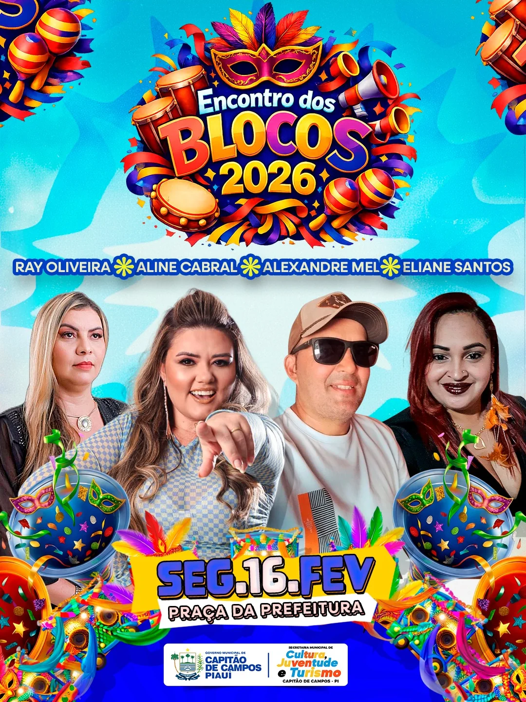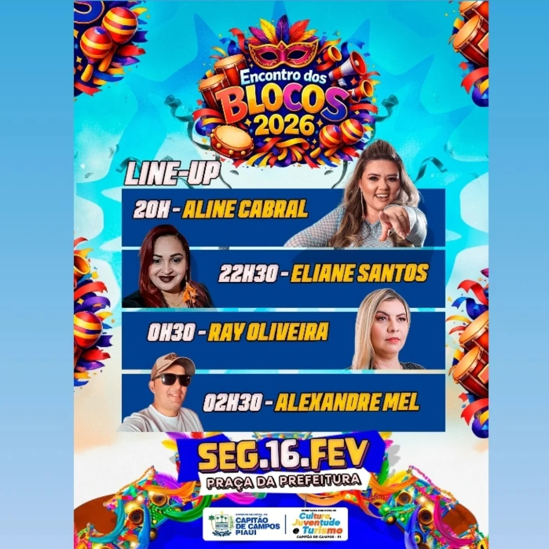 O Carnaval 2026 já começa em grande estilo em Capitão de Campos! A Prefeitura Municipal, por meio da Secretaria Municipal de Cultura, Juventude e Turismo (SEMCUJT), realiza no dia segunda-feira, 16 de fevereiro, o aguardado Encontro dos Blocos 2026, a partir das 19h, na Praça da Prefeitura.