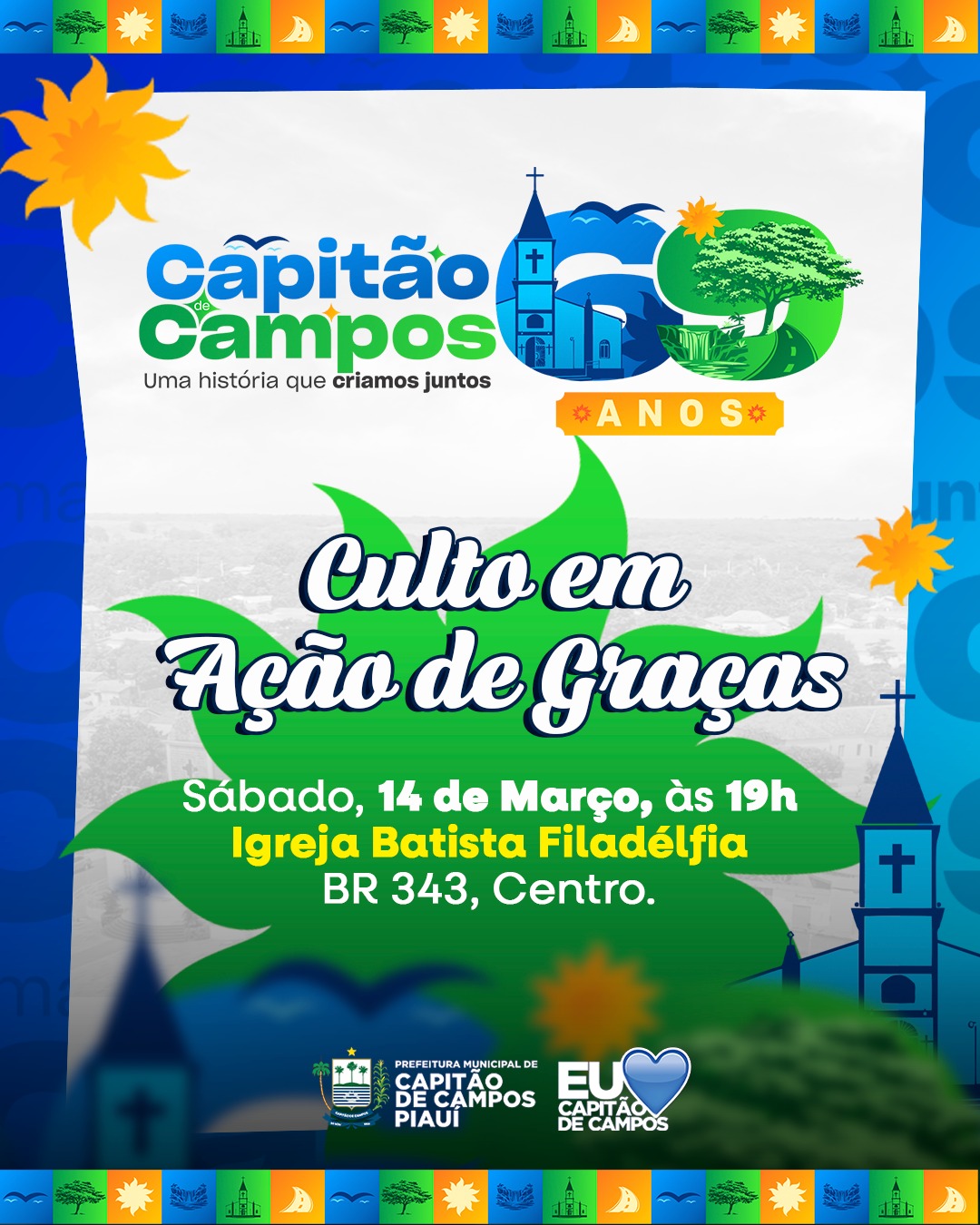 Dentro da programação comemorativa pelos 69 anos de Capitão de Campos, será realizado um Culto em Ação de Graças, reunindo fiéis e a comunidade para um momento de fé, gratidão e reflexão.