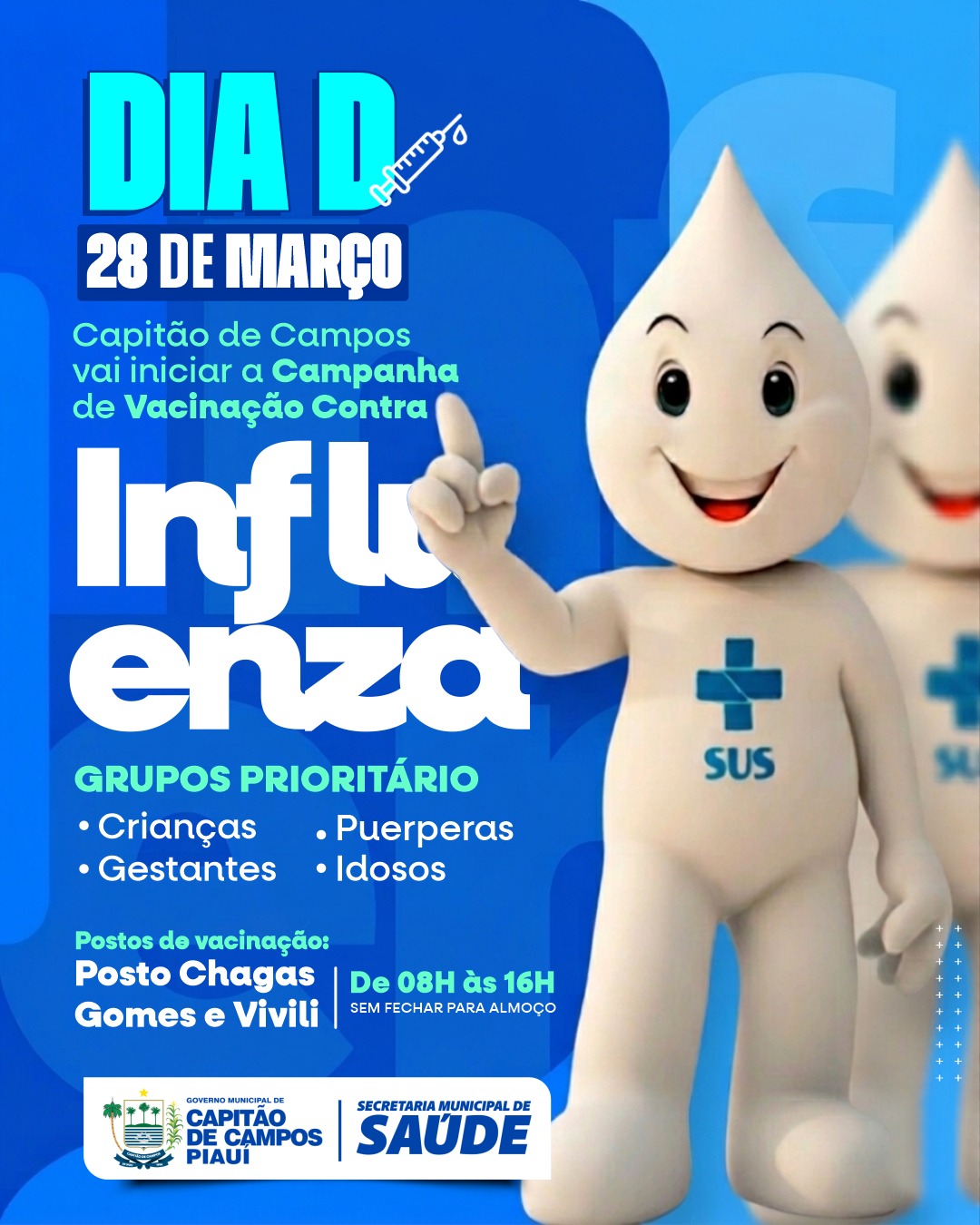 A Prefeitura Municipal de Capitão de Campos, por meio da Secretaria Municipal de Saúde, dará início à Campanha de Vacinação contra a Influenza no próximo dia 28 de março. A ação tem como objetivo proteger a população contra o vírus da gripe e reduzir complicações causadas pela doença, especialmente entre os grupos mais vulneráveis.